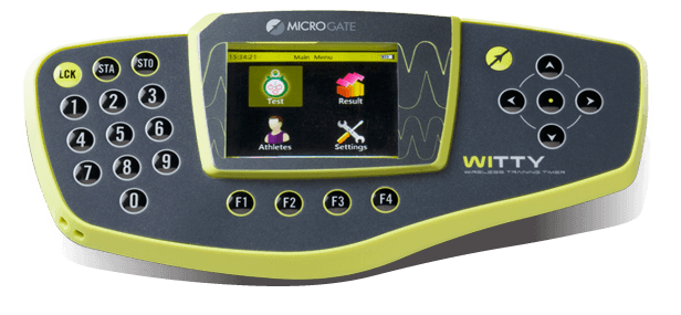 Die kompakten Ausmaße, die anatomische Form und das innovative Design machen Witty zum praktischen und einfachen Zeitmesssystem. Grafische Symbole und Hilfemeldungen auf dem Farbdisplay gewähren einen einfachen Gebrauch und kurze Lernzeiten. Aufgrund der 8 verschiedenen Funkfrequenzen ist es möglich, gleichzeitig mit mehreren Witty-Zeitmesssystemen (Zeitmesser und Lichtschranken) im selben Trainingsbereich zu arbeiten. Einige Testtypen sind bereits voreingestellt (Einzeln, Gruppen, In-line, Hin und Retour, Zähler usw.), der Benutzer hat jedoch die Möglichkeit, direkt am Zeitmesser benutzerdefinierte Testtypen zu erstellen. Witty speichert und zeigt alle Zeiten an und überträgt sie in Hochgeschwindigkeit an einen PC.